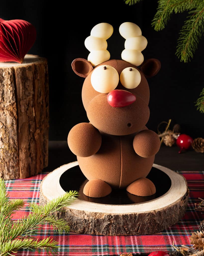 Le renne au nez rouge, prend vie en chocolat au lait et blanc garni d’amandes et de noisettes enrobées.