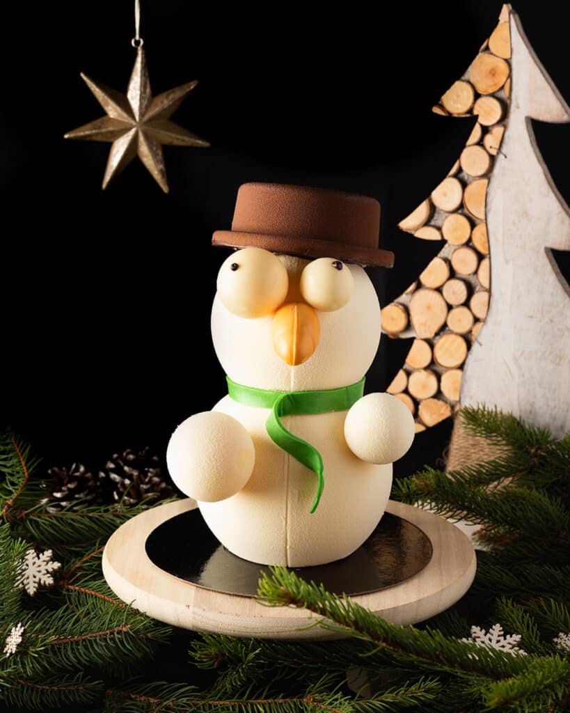Façonné dans du chocolat blanc et noir, ce bonhomme de neige est garni d’amandes et de noisettes enrobées.