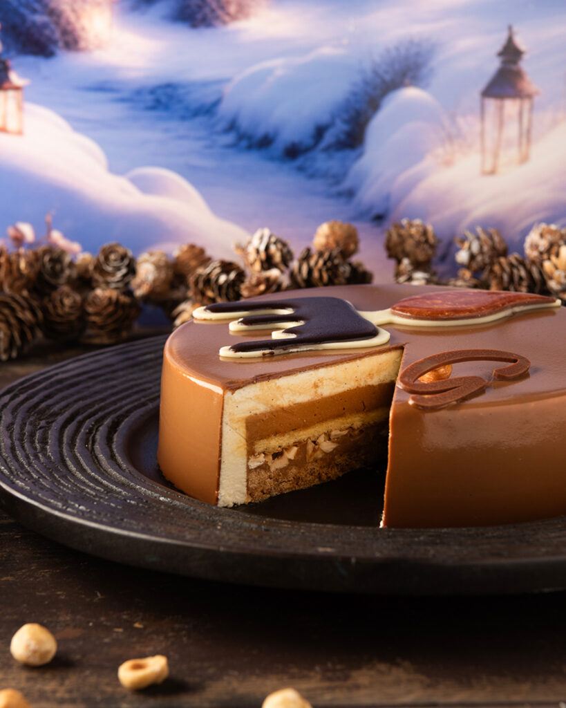 Un clin d’œil au Grand Nord avec sa forme d’igloo élégant, cette bûche réunit des saveurs harmonieuses dans une présentation unique. Une crème glacée vanille, renfermant en son coeur un généreux caramel coulant, des cacahuètes caramélisées pour une note craquante et une meringue dacquoise à l’amande pour une texture légère et fondante.