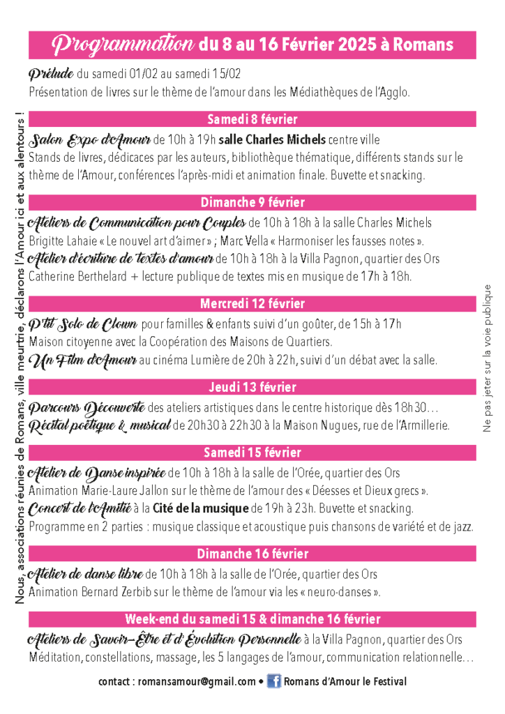 Romans-sur-isère a toujours été une ville d’histoires et d’émotions. Autrefois, son Salon du Livre, créé par Christian Vinson et porté par une association dynamique, rayonnait bien au-delà de la région. Aujourd’hui, l’association Romans d’Amour initié par Georges Perret redonne vie à cette tradition avec un festival inédit entièrement dédié à l’amour et à ses multiples expressions artistiques.