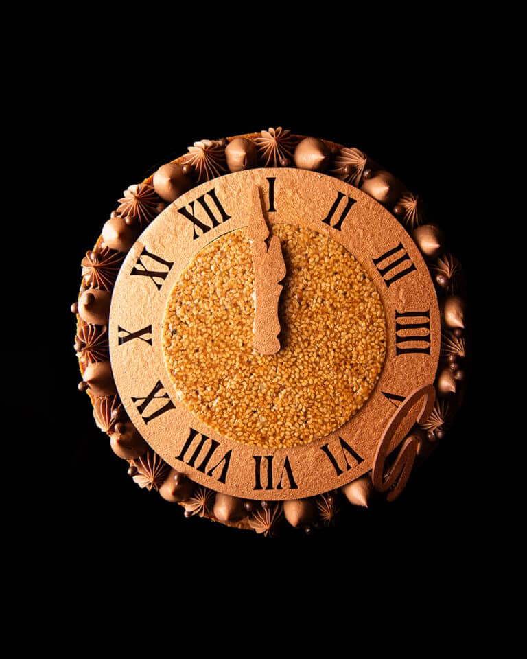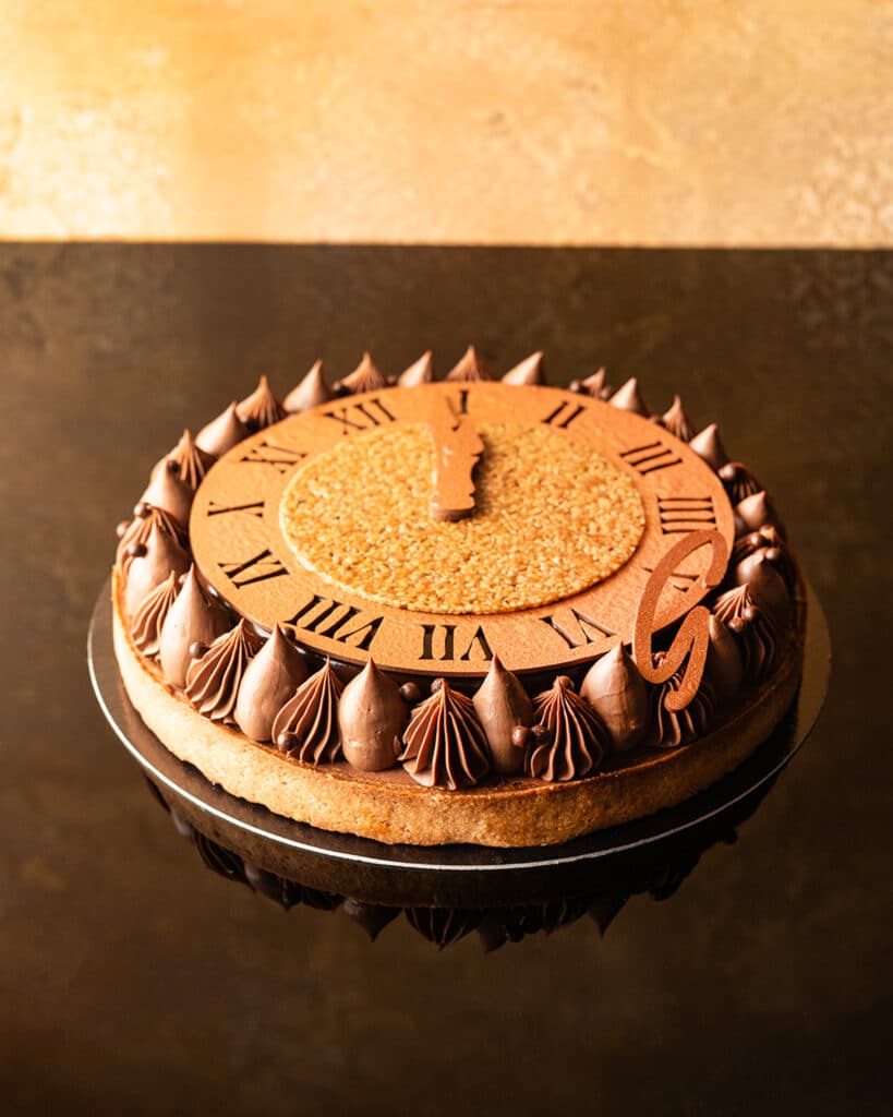 Le temps s’arrête pour céder place à notre dessert festif de fin d’année, un délice gourmand dédié à célébrer une nouvelle année ! À déguster en famille ou entre amis, ce chef-d’oeuvre sucré, conçu pour 6-8 convives, promet de faire de votre réveillon une célébration mémorable !